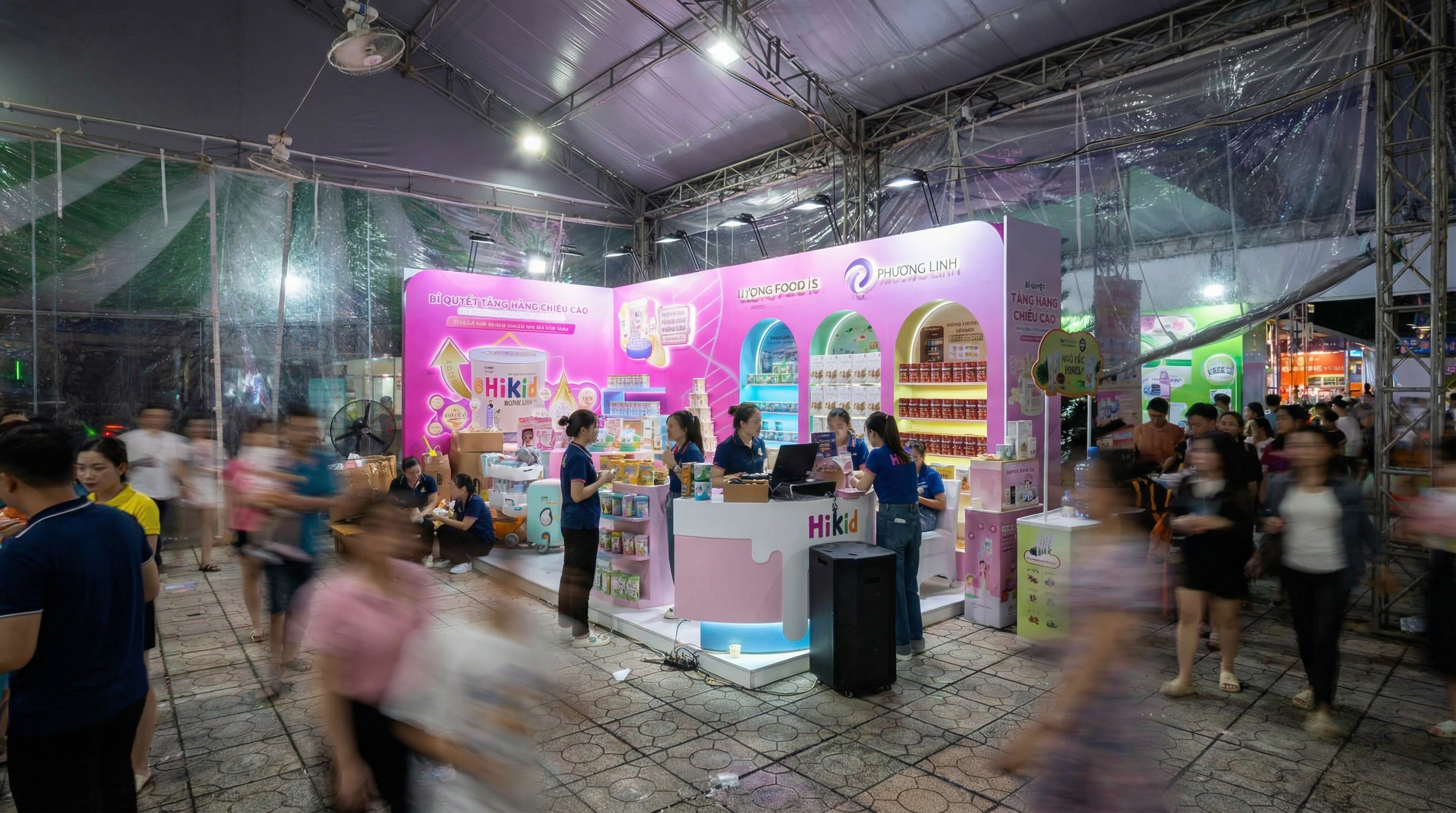 Gian hàng nên ưu tiên không gian mở, thay vì thiết kế kín. Điều này giúp khách dễ tiếp cận từ nhiều hướng và tạo cảm giác thân thiện hơn. Hình ảnh sử dụng trong booth nên có kích thước lớn, rõ ràng và đánh đúng cảm xúc của khách hàng mục tiêu (mẹ & bé, gia đình, sự an toàn). Ngoài ra, đừng bỏ qua yếu tố con người. Một đội ngũ tư vấn tốt sẽ giúp bạn tận dụng tối đa lượng khách ghé thăm. Họ cần: